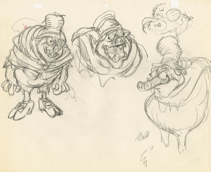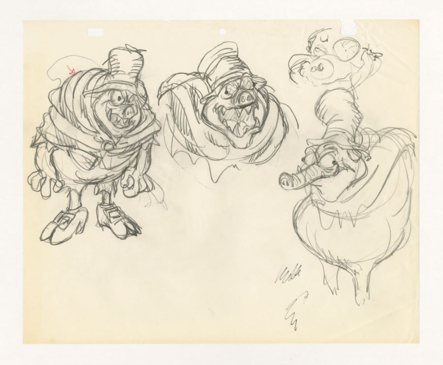 A character development drawing from the Ralph Bakshi Studios. Featuring four surly pig characters, the drawing was created at the studio and used during the animation process. Measuring 10.5"x12.5" overall, with the image area measuring 8.5"x12", the drawing is in very good condition with edge wear, including creasing and a torn peg hole.